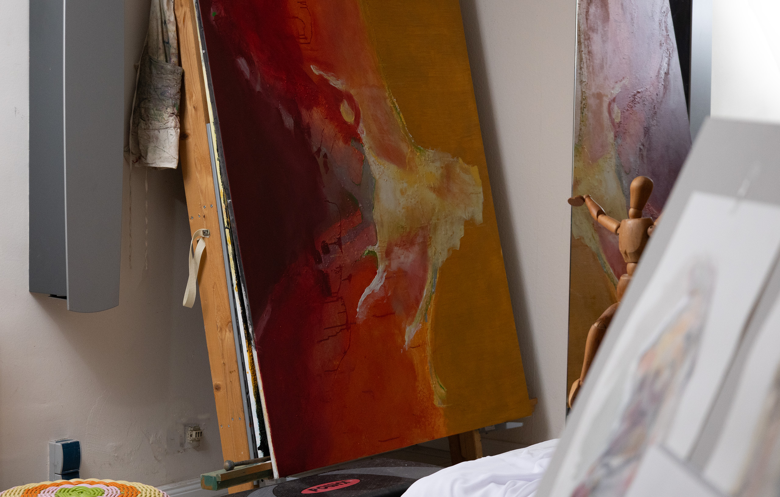This early stage of my work shows a composition predominantly laid out with tempera colors. By applying oil glazes in multiple layers, a deep, luminous coloration is created. The intermediate stages of white highlighting emphasize the lights and contrasts, giving the image more plasticity and depth.“